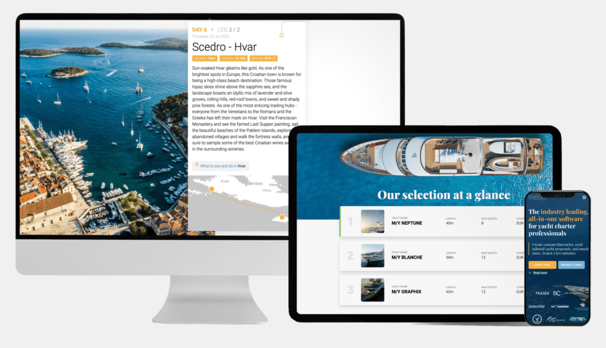 Charter Itinerary aims to streamline the management of charter operations through their software solutions by facilitating the creation of custom itineraries, yacht proposals, interactive guest preferences and booking management. Co-founded by Boris De Bel and Candice Christiansen in 2021, the Charter Itinerary software also includes tools for contract payment tracking, guest preference customisation and secure document sharing via a password-protected client space.